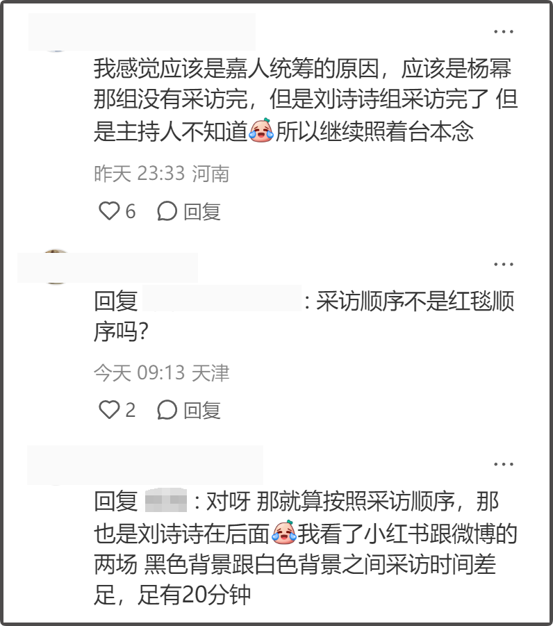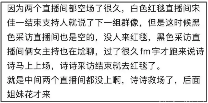 有网友称可能是时代姐妹花采访时间太长来不及,就让刘诗诗先上,但据网友描述,不管是红毯还是采访直播间都空场很久,后来刘诗诗上场才填补空白。