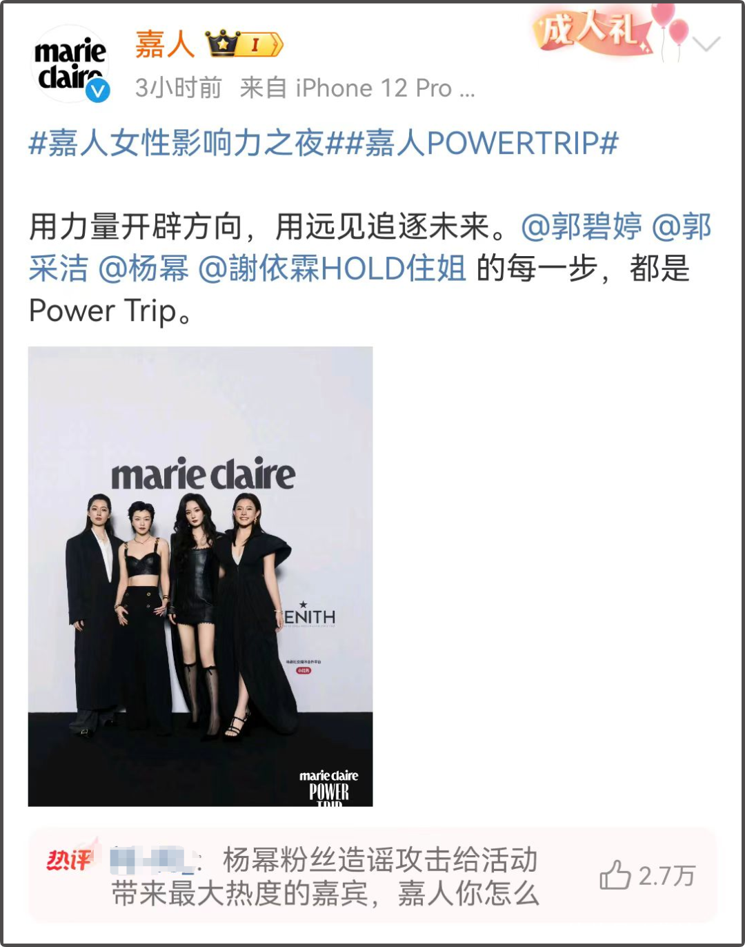 活动第二天,杂志方才按现场出场顺序,发了刘诗诗、杨幂、刘亦菲的官方照,评论区立马沦陷,不少人跑到刘诗诗和杨幂相关的评论区吵架,逼得杂志方精选了刘诗诗的那条微博评论区,但杨幂那条微博评论区依旧吵得很热闹。